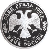 изображение двуглавого орла (художник И. Билибин), по кругу надписи: вверху — «ОДИН РУБЛЬ 1997 г.», внизу — «БАНК РОССИИ». В нижней части — обозначение металла, проба сплава, содержание драгоценного металла в чистоте и товарный знак монетного двора.